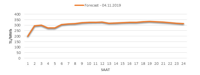 Yarından sonraki gün için oluşacak ortalama piyasa takas fiyatı 310.86 TL/MWH olarak tahmin edilmektedir. Buna bağlı olarak günün maksimum fiyatı 333.83 TL/MWh olarak 18:00 – 19:00 saat aralığında, minimum fiyatı 200.01 TL/MWh olarak :00 – 01:00 saat aralığında gerçekleşeceği öngörülmektedir. Puant saatlerde (17:00 – 22:00) tahmini ortalama piyasa takas fiyatı ise 326.85 TL/MWh olarak hesaplanabilmektedir. Saatlik oluşacak piyasa takas fiyatı tahminleri aşağıdaki grafikte yer almaktadır.