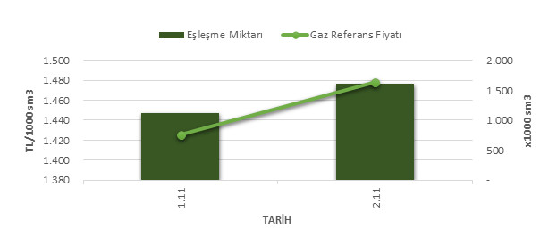 Organize Toptan Doğal Gaz Satış Piyasası (OTSP) dahilinde 01.11.2019 – 02.11.2019 tarihleri arası ortalama Gaz Referans Fiyatı (GRF) 1,451.93 TL/1000 sm3 olarak belirlenirken, aynı tarihler arasında toplam gerçekleşen eşleşmelerin miktarı ise 2,736 x1000 sm3 olarak belirlendi. İlgili tarihler arasında günlük Gaz Referans Fiyatı (GRF) ile Eşleşme Miktarı verileri aşağıdaki grafikte yer almaktadır.