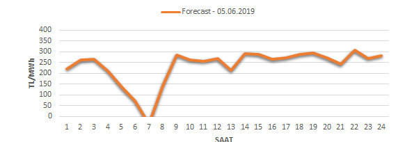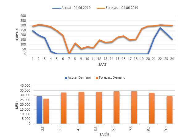 Tahminleme Modeli* analizi sonucu ortalama piyasa takas fiyatı 199.76 TL/MWh ve ortalama tüketim 33,482 MWh olarak öngörülmektedir. Modelin piyasa takas fiyatına dair başarı oranı günlük % 44, tüketime dair başarı oranı** ise günlük % 91 olarak hesaplanırken, bugüne kadar yapılan piyasa takas fiyatına dair analizlere göre başarı oranı % 88, tüketime dair başarı oranı ise % 95 olarak hesaplanmaktadır. Saatlik yarın için oluşan ve tahmin edilen piyasa takas fiyatları ile haftalık bazda tahmin edilen ve gerçekleştikçe yer alacak günlük ortalama tüketim değerleri aşağıdaki grafiklerde yer almaktadır.