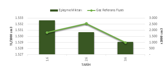 Organize Toptan Doğal Gaz Satış Piyasası (OTSP) dahilinde 01.06.2019 – 03.06.2019 tarihleri arası ortalama Gaz Referans Fiyatı (GRF) 1,530.56 TL/1000 sm3 olarak belirlenirken, aynı tarihler arasında toplam gerçekleşen eşleşmelerin miktarı ise 5,695 x1000 sm3 olarak belirlendi. İlgili tarihler arasında günlük Gaz Referans Fiyatı (GRF) ile Eşleşme Miktarı verileri aşağıdaki grafikte yer almaktadır.
