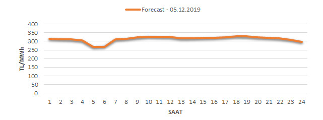 Yarından sonraki gün için oluşacak ortalama piyasa takas fiyatı 314.13 TL/MWH olarak tahmin edilmektedir. Buna bağlı olarak günün maksimum fiyatı 329.25 TL/MWh olarak 17:0018:00 saat aralığında, minimum fiyatı 269 TL/MWh olarak 04:0005:00 saat aralığında gerçekleşeceği öngörülmektedir. Puant saatlerde (17:0022:00) tahmini ortalama piyasa takas fiyatı ise 321.16 TL/MWh olarak hesaplanabilmektedir. Saatlik oluşacak piyasa takas fiyatı tahminleri aşağıdaki grafikte yer almaktadır.