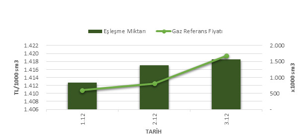 Organize Toptan Doğal Gaz Satış Piyasası (OTSP) dahilinde 01.12.201903.12.2019 tarihleri arası ortalama Gaz Referans Fiyatı (GRF) 1,414.27 TL/1000 sm3 olarak belirlenirken, aynı tarihler arasında toplam gerçekleşen eşleşmelerin miktarı ise 3,779 x1000 sm3 olarak belirlendi. İlgili tarihler arasında günlük Gaz Referans Fiyatı (GRF) ile Eşleşme Miktarı verileri aşağıdaki grafikte yer almaktadır.
