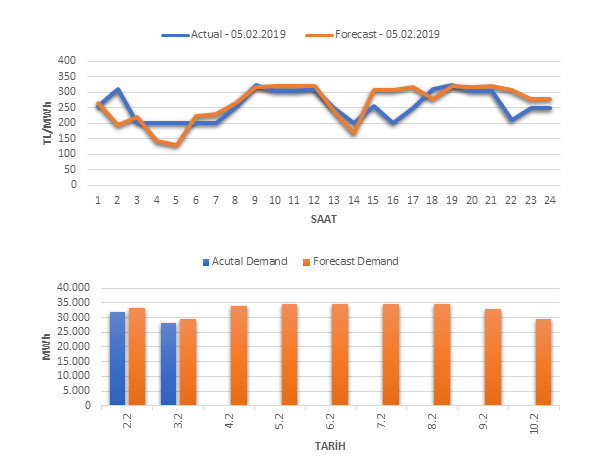 Tahminleme Modeli* analizi sonucu ortalama piyasa takas fiyatı 265.42 TL/MWh ve ortalama tüketim 34,758 MWh olarak öngörülmektedir. Modelin piyasa takas fiyatına dair başarı oranı günlük % 61, tüketime dair başarı oranı** ise günlük % 96 olarak hesaplanırken, bugüne kadar yapılan piyasa takas fiyatına dair analizlere göre başarı oranı % 88, tüketime dair başarı oranı ise % 94 olarak hesaplanmaktadır. Saatlik yarın için oluşan ve tahmin edilen piyasa takas fiyatları ile haftalık bazda tahmin edilen ve gerçekleştikçe yer alacak günlük ortalama tüketim değerleri aşağıdaki grafiklerde yer almaktadır.