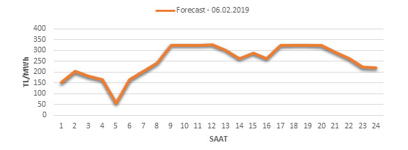 Yarından sonraki gün için oluşacak ortalama piyasa takas fiyatı 251.72 TL/MWH olarak tahmin edilmektedir. Buna bağlı olarak günün maksimum fiyatı 324.98 TL/MWh olarak 11:0012:00 saat aralığında, minimum fiyatı 57.68 TL/MWh olarak 04:0005:00 saat aralığında gerçekleşeceği öngörülmektedir. Puant saatlerde (17:0022:00) tahmini ortalama piyasa takas fiyatı ise 290.04 TL/MWh olarak hesaplanabilmektedir. Saatlik oluşacak piyasa takas fiyatı tahminleri aşağıdaki grafikte yer almaktadır.