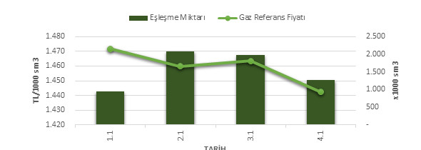 Organize Toptan Doğal Gaz Satış Piyasası (OTSP) dahilinde 01.02.201904.02.2019 tarihleri arası ortalama Gaz Referans Fiyatı (GRF) 1,459.34 TL/1000 sm3 olarak belirlenirken, aynı tarihler arasında toplam gerçekleşen eşleşmelerin miktarı ise 6,246 x1000 sm3 olarak belirlendi. İlgili tarihler arasında günlük Gaz Referans Fiyatı (GRF) ile Eşleşme Miktarı verileri aşağıdaki grafikte yer almaktadır.