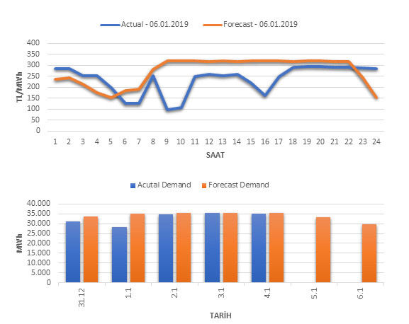 *Tahminleme Modeli; istatistiksel tahminleme metodu olan SARIMA (Seasonal Autoregressive Integrated Moving Average) kullanılarak MATLAB yazılım geliştirme platformunda hazırlanmıştır. Model ve diğer tüm kullanılan veriler dahilinde girdi verileri olarak EPİAŞ Şeffaflık Platformunda günlük yayınlanan piyasa takas fiyatları ve gerçekleşen tüketim verileri kullanılmaktadır. Model ile ilgili detaylı bilgi alabilmek için lütfen iletişime geçiniz.