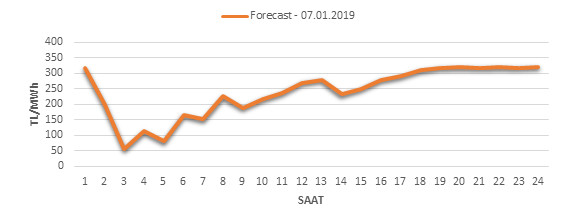 Yarından sonraki gün için oluşacak ortalama piyasa takas fiyatı 239.95 TL/MWH olarak tahmin edilmektedir. Buna bağlı olarak günün maksimum fiyatı 319.2 TL/MWh olarak 23:00 – Avg.:00 saat aralığında, minimum fiyatı 57.05 TL/MWh olarak 02:00 – 03:00 saat aralığında gerçekleşeceği öngörülmektedir. Puant saatlerde (17:00 – 22:00) tahmini ortalama piyasa takas fiyatı ise 316.15 TL/MWh olarak hesaplanabilmektedir. Saatlik oluşacak piyasa takas fiyatı tahminleri aşağıdaki grafikte yer almaktadır.