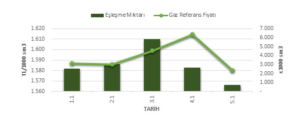 Organize Toptan Doğal Gaz Satış Piyasası (OTSP) dahilinde 01.12.2018 – 05.01.2019 tarihleri arası ortalama Gaz Referans Fiyatı (GRF) 1,593.29 TL/1000 sm3 olarak belirlenirken, aynı tarihler arasında toplam gerçekleşen eşleşmelerin miktarı ise 14,688 x1000 sm3 olarak belirlendi. İlgili tarihler arasında günlük Gaz Referans Fiyatı (GRF) ile Eşleşme Miktarı verileri aşağıdaki grafikte yer almaktadır.