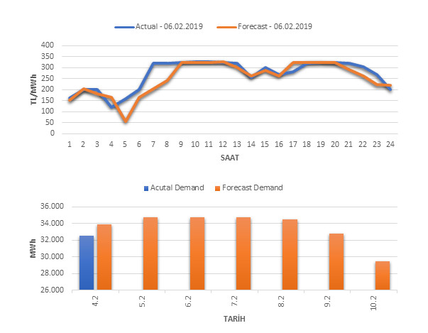 Tahminleme Modeli* analizi sonucu ortalama piyasa takas fiyatı 251.72 TL/MWh ve ortalama tüketim 34,727 MWh olarak öngörülmektedir. Modelin piyasa takas fiyatına dair başarı oranı günlük % 79, tüketime dair başarı oranı** ise günlük % 96 olarak hesaplanırken, bugüne kadar yapılan piyasa takas fiyatına dair analizlere göre başarı oranı % 88, tüketime dair başarı oranı ise % 94 olarak hesaplanmaktadır. Saatlik yarın için oluşan ve tahmin edilen piyasa takas fiyatları ile haftalık bazda tahmin edilen ve gerçekleştikçe yer alacak günlük ortalama tüketim değerleri aşağıdaki grafiklerde yer almaktadır.