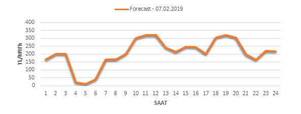 Yarından sonraki gün için oluşacak ortalama piyasa takas fiyatı 208.21 TL/MWH olarak tahmin edilmektedir. Buna bağlı olarak günün maksimum fiyatı 321.13 TL/MWh olarak 11:00 – 12:00 saat aralığında, minimum fiyatı 10.33 TL/MWh olarak 04:00 – 05:00 saat aralığında gerçekleşeceği öngörülmektedir. Puant saatlerde (17:00 – 22:00) tahmini ortalama piyasa takas fiyatı ise 252.6 TL/MWh olarak hesaplanabilmektedir. Saatlik oluşacak piyasa takas fiyatı tahminleri aşağıdaki grafikte yer almaktadır.