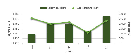 Organize Toptan Doğal Gaz Satış Piyasası (OTSP) dahilinde 01.02.2019 – 05.02.2019 tarihleri arası ortalama Gaz Referans Fiyatı (GRF) 1,460.85 TL/1000 sm3 olarak belirlenirken, aynı tarihler arasında toplam gerçekleşen eşleşmelerin miktarı ise 9,048 x1000 sm3 olarak belirlendi. İlgili tarihler arasında günlük Gaz Referans Fiyatı (GRF) ile Eşleşme Miktarı verileri aşağıdaki grafikte yer almaktadır.