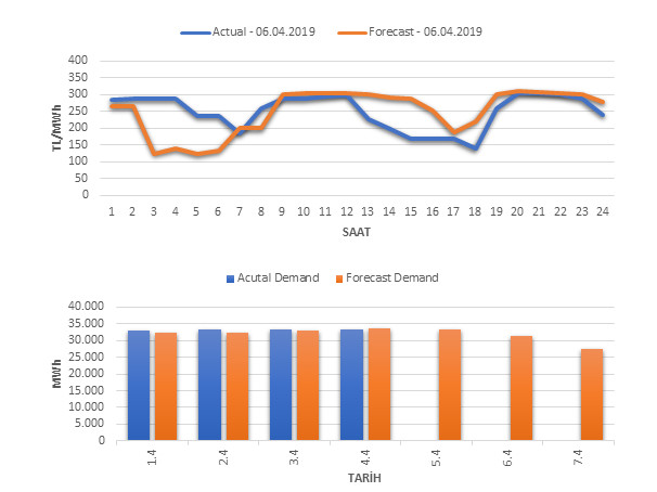 Tahminleme Modeli* analizi sonucu ortalama piyasa takas fiyatı 251.05 TL/MWh ve ortalama tüketim 31,239 MWh olarak öngörülmektedir. Modelin piyasa takas fiyatına dair başarı oranı günlük % 57, tüketime dair başarı oranı** ise günlük % 99 olarak hesaplanırken, bugüne kadar yapılan piyasa takas fiyatına dair analizlere göre başarı oranı % 88, tüketime dair başarı oranı ise % 95 olarak hesaplanmaktadır. Saatlik yarın için oluşan ve tahmin edilen piyasa takas fiyatları ile haftalık bazda tahmin edilen ve gerçekleştikçe yer alacak günlük ortalama tüketim değerleri aşağıdaki grafiklerde yer almaktadır.