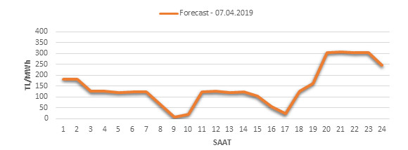 Yarından sonraki gün için oluşacak ortalama piyasa takas fiyatı 145.26 TL/MWH olarak tahmin edilmektedir. Buna bağlı olarak günün maksimum fiyatı 306.18 TL/MWh olarak 20:00 – 21:00 saat aralığında, minimum fiyatı 7.98 TL/MWh olarak 08:00 – 09:00 saat aralığında gerçekleşeceği öngörülmektedir. Puant saatlerde (17:00 – 22:00) tahmini ortalama piyasa takas fiyatı ise 250.03 TL/MWh olarak hesaplanabilmektedir. Saatlik oluşacak piyasa takas fiyatı tahminleri aşağıdaki grafikte yer almaktadır.