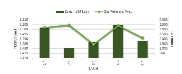 Organize Toptan Doğal Gaz Satış Piyasası (OTSP) dahilinde 01.03.2019 – 05.04.2019 tarihleri arası ortalama Gaz Referans Fiyatı (GRF) 1,497.37 TL/1000 sm3 olarak belirlenirken, aynı tarihler arasında toplam gerçekleşen eşleşmelerin miktarı ise 11,182 x1000 sm3 olarak belirlendi. İlgili tarihler arasında günlük Gaz Referans Fiyatı (GRF) ile Eşleşme Miktarı verileri aşağıdaki grafikte yer almaktadır.
