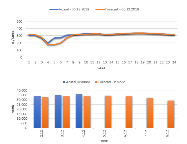 Tahminleme Modeli* analizi sonucu ortalama piyasa takas fiyatı 299.55 TL/MWh ve ortalama tüketim 34,180 MWh olarak öngörülmektedir. Modelin piyasa takas fiyatına dair başarı oranı günlük % 80, tüketime dair başarı oranı** ise günlük % 95 olarak hesaplanırken, bugüne kadar yapılan piyasa takas fiyatına dair analizlere göre başarı oranı % 91, tüketime dair başarı oranı ise % 94 olarak hesaplanmaktadır. Saatlik yarın için oluşan ve tahmin edilen piyasa takas fiyatları ile haftalık bazda tahmin edilen ve gerçekleştikçe yer alacak günlük ortalama tüketim değerleri aşağıdaki grafiklerde yer almaktadır.