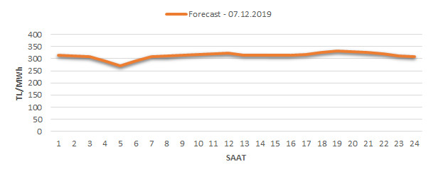 Yarından sonraki gün için oluşacak ortalama piyasa takas fiyatı 313.48 TL/MWH olarak tahmin edilmektedir. Buna bağlı olarak günün maksimum fiyatı 332.13 TL/MWh olarak 18:00 – 19:00 saat aralığında, minimum fiyatı 271.78 TL/MWh olarak 04:00 – 05:00 saat aralığında gerçekleşeceği öngörülmektedir. Puant saatlerde (17:00 – 22:00) tahmini ortalama piyasa takas fiyatı ise 324.51 TL/MWh olarak hesaplanabilmektedir. Saatlik oluşacak piyasa takas fiyatı tahminleri aşağıdaki grafikte yer almaktadır.