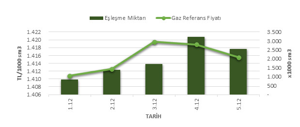Organize Toptan Doğal Gaz Satış Piyasası (OTSP) dahilinde 01.12.2019 – 05.12.2019 tarihleri arası ortalama Gaz Referans Fiyatı (GRF) 1,415.43 TL/1000 sm3 olarak belirlenirken, aynı tarihler arasında toplam gerçekleşen eşleşmelerin miktarı ise 9,720 x1000 sm3 olarak belirlendi. İlgili tarihler arasında günlük Gaz Referans Fiyatı (GRF) ile Eşleşme Miktarı verileri aşağıdaki grafikte yer almaktadır.