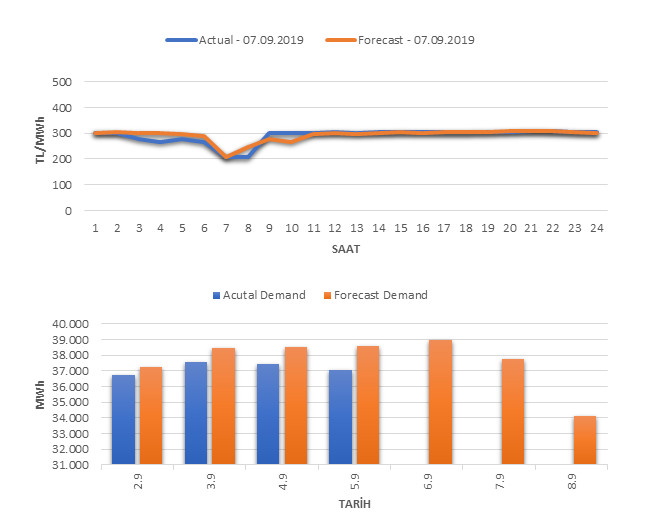 Tahminleme Modeli* analizi sonucu ortalama piyasa takas fiyatı 295.04 TL/MWh ve ortalama tüketim 37,730 MWh olarak öngörülmektedir. Modelin piyasa takas fiyatına dair başarı oranı günlük % 85, tüketime dair başarı oranı** ise günlük % 96 olarak hesaplanırken, bugüne kadar yapılan piyasa takas fiyatına dair analizlere göre başarı oranı % 91, tüketime dair başarı oranı ise % 94 olarak hesaplanmaktadır. Saatlik yarın için oluşan ve tahmin edilen piyasa takas fiyatları ile haftalık bazda tahmin edilen ve gerçekleştikçe yer alacak günlük ortalama tüketim değerleri aşağıdaki grafiklerde yer almaktadır.