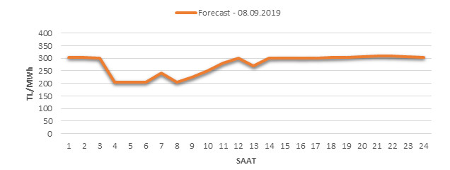 Yarından sonraki gün için oluşacak ortalama piyasa takas fiyatı 277.46 TL/MWH olarak tahmin edilmektedir. Buna bağlı olarak günün maksimum fiyatı 310.09 TL/MWh olarak 20:00 – 21:00 saat aralığında, minimum fiyatı 205.99 TL/MWh olarak 05:00 – 06:00 saat aralığında gerçekleşeceği öngörülmektedir. Puant saatlerde (17:00 – 22:00) tahmini ortalama piyasa takas fiyatı ise 307.11 TL/MWh olarak hesaplanabilmektedir. Saatlik oluşacak piyasa takas fiyatı tahminleri aşağıdaki grafikte yer almaktadır.