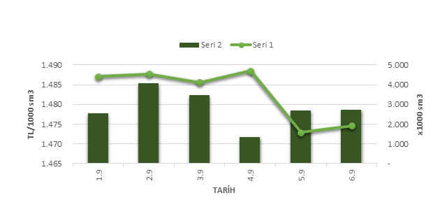 Organize Toptan Doğal Gaz Satış Piyasası (OTSP) dahilinde 01.09.2019 – 06.09.2019 tarihleri arası ortalama Gaz Referans Fiyatı (GRF) 1,482.74 TL/1000 sm3 olarak belirlenirken, aynı tarihler arasında toplam gerçekleşen eşleşmelerin miktarı ise 16,840 x1000 sm3 olarak belirlendi. İlgili tarihler arasında günlük Gaz Referans Fiyatı (GRF) ile Eşleşme Miktarı verileri aşağıdaki grafikte yer almaktadır.