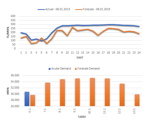 Tahminleme Modeli* analizi sonucu ortalama piyasa takas fiyatı 187.79 TL/MWh ve ortalama tüketim 34,824 MWh olarak öngörülmektedir. Modelin piyasa takas fiyatına dair başarı oranı günlük % 66, tüketime dair başarı oranı** ise günlük % 97 olarak hesaplanırken, bugüne kadar yapılan piyasa takas fiyatına dair analizlere göre başarı oranı % 88, tüketime dair başarı oranı ise % 94 olarak hesaplanmaktadır. Saatlik yarın için oluşan ve tahmin edilen piyasa takas fiyatları ile haftalık bazda tahmin edilen ve gerçekleştikçe yer alacak günlük ortalama tüketim değerleri aşağıdaki grafiklerde yer almaktadır.