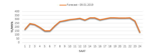 Yarından sonraki gün için oluşacak ortalama piyasa takas fiyatı 265.18 TL/MWH olarak tahmin edilmektedir. Buna bağlı olarak günün maksimum fiyatı 319.27 TL/MWh olarak 21:00 – 22:00 saat aralığında, minimum fiyatı 134.59 TL/MWh olarak 23:00 – Avg.:00 saat aralığında gerçekleşeceği öngörülmektedir. Puant saatlerde (17:00 – 22:00) tahmini ortalama piyasa takas fiyatı ise 311.65 TL/MWh olarak hesaplanabilmektedir. Saatlik oluşacak piyasa takas fiyatı tahminleri aşağıdaki grafikte yer almaktadır.