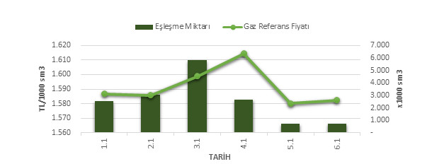 Organize Toptan Doğal Gaz Satış Piyasası (OTSP) dahilinde 01.12.2018 – 07.01.2019 tarihleri arası ortalama Gaz Referans Fiyatı (GRF) 1,589.57 TL/1000 sm3 olarak belirlenirken, aynı tarihler arasında toplam gerçekleşen eşleşmelerin miktarı ise 16,785 x1000 sm3 olarak belirlendi. İlgili tarihler arasında günlük Gaz Referans Fiyatı (GRF) ile Eşleşme Miktarı verileri aşağıdaki grafikte yer almaktadır.
