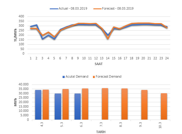 Tahminleme Modeli* analizi sonucu ortalama piyasa takas fiyatı 284.33 TL/MWh ve ortalama tüketim 35,794 MWh olarak öngörülmektedir. Modelin piyasa takas fiyatına dair başarı oranı günlük % 88, tüketime dair başarı oranı** ise günlük % 80 olarak hesaplanırken, bugüne kadar yapılan piyasa takas fiyatına dair analizlere göre başarı oranı % 88, tüketime dair başarı oranı ise % 95 olarak hesaplanmaktadır. Saatlik yarın için oluşan ve tahmin edilen piyasa takas fiyatları ile haftalık bazda tahmin edilen ve gerçekleştikçe yer alacak günlük ortalama tüketim değerleri aşağıdaki grafiklerde yer almaktadır.