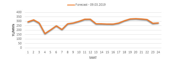 Yarından sonraki gün için oluşacak ortalama piyasa takas fiyatı 281.71 TL/MWH olarak tahmin edilmektedir. Buna bağlı olarak günün maksimum fiyatı 330.11 TL/MWh olarak 19:00 – 20:00 saat aralığında, minimum fiyatı 160.82 TL/MWh olarak 03:00 – 04:00 saat aralığında gerçekleşeceği öngörülmektedir. Puant saatlerde (17:00 – 22:00) tahmini ortalama piyasa takas fiyatı ise 314.72 TL/MWh olarak hesaplanabilmektedir. Saatlik oluşacak piyasa takas fiyatı tahminleri aşağıdaki grafikte yer almaktadır.
