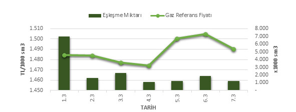 Organize Toptan Doğal Gaz Satış Piyasası (OTSP) dahilinde 01.03.2019 – 07.03.2019 tarihleri arası ortalama Gaz Referans Fiyatı (GRF) 1,487.68 TL/1000 sm3 olarak belirlenirken, aynı tarihler arasında toplam gerçekleşen eşleşmelerin miktarı ise 16,254 x1000 sm3 olarak belirlendi. İlgili tarihler arasında günlük Gaz Referans Fiyatı (GRF) ile Eşleşme Miktarı verileri aşağıdaki grafikte yer almaktadır.
