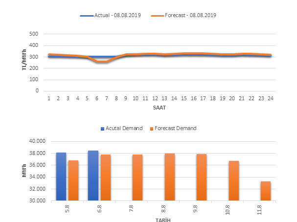 Tahminleme Modeli* analizi sonucu ortalama piyasa takas fiyatı 315.45 TL/MWh ve ortalama tüketim 37,922 MWh olarak öngörülmektedir. Modelin piyasa takas fiyatına dair başarı oranı günlük % 28, tüketime dair başarı oranı** ise günlük % 98 olarak hesaplanırken, bugüne kadar yapılan piyasa takas fiyatına dair analizlere göre başarı oranı % 91, tüketime dair başarı oranı ise % 94 olarak hesaplanmaktadır. Saatlik yarın için oluşan ve tahmin edilen piyasa takas fiyatları ile haftalık bazda tahmin edilen ve gerçekleştikçe yer alacak günlük ortalama tüketim değerleri aşağıdaki grafiklerde yer almaktadır.