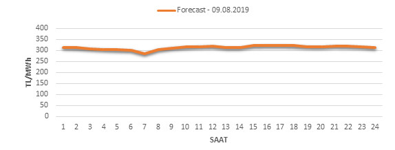 Yarından sonraki gün için oluşacak ortalama piyasa takas fiyatı 311.91 TL/MWH olarak tahmin edilmektedir. Buna bağlı olarak günün maksimum fiyatı 321.35 TL/MWh olarak 16:00 – 17:00 saat aralığında, minimum fiyatı 284.99 TL/MWh olarak 06:00 – 07:00 saat aralığında gerçekleşeceği öngörülmektedir. Puant saatlerde (17:00 – 22:00) tahmini ortalama piyasa takas fiyatı ise 317.28 TL/MWh olarak hesaplanabilmektedir. Saatlik oluşacak piyasa takas fiyatı tahminleri aşağıdaki grafikte yer almaktadır.