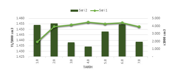 Organize Toptan Doğal Gaz Satış Piyasası (OTSP) dahilinde 01.08.2019 – 07.08.2019 tarihleri arası ortalama Gaz Referans Fiyatı (GRF) 1,452.16 TL/1000 sm3 olarak belirlenirken, aynı tarihler arasında toplam gerçekleşen eşleşmelerin miktarı ise 21,122 x1000 sm3 olarak belirlendi. İlgili tarihler arasında günlük Gaz Referans Fiyatı (GRF) ile Eşleşme Miktarı verileri aşağıdaki grafikte yer almaktadır.