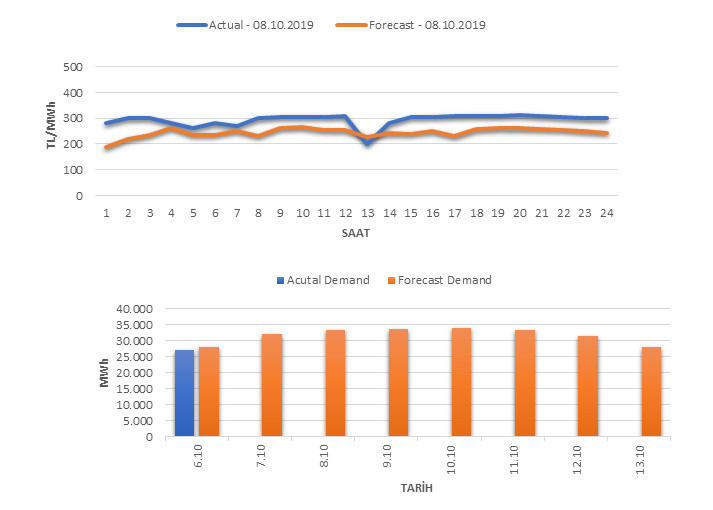 Tahminleme Modeli* analizi sonucu ortalama piyasa takas fiyatı 245.55 TL/MWh ve ortalama tüketim 33,505 MWh olarak öngörülmektedir. Modelin piyasa takas fiyatına dair başarı oranı günlük % 53, tüketime dair başarı oranı** ise günlük % 96 olarak hesaplanırken, bugüne kadar yapılan piyasa takas fiyatına dair analizlere göre başarı oranı % 91, tüketime dair başarı oranı ise % 93 olarak hesaplanmaktadır. Saatlik yarın için oluşan ve tahmin edilen piyasa takas fiyatları ile haftalık bazda tahmin edilen ve gerçekleştikçe yer alacak günlük ortalama tüketim değerleri aşağıdaki grafiklerde yer almaktadır.
