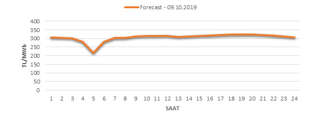 Yarından sonraki gün için oluşacak ortalama piyasa takas fiyatı 305.41 TL/MWH olarak tahmin edilmektedir. Buna bağlı olarak günün maksimum fiyatı 322.48 TL/MWh olarak 19:00 – 20:00 saat aralığında, minimum fiyatı 215.01 TL/MWh olarak 04:00 – 05:00 saat aralığında gerçekleşeceği öngörülmektedir. Puant saatlerde (17:00 – 22:00) tahmini ortalama piyasa takas fiyatı ise 318.69 TL/MWh olarak hesaplanabilmektedir. Saatlik oluşacak piyasa takas fiyatı tahminleri aşağıdaki grafikte yer almaktadır.