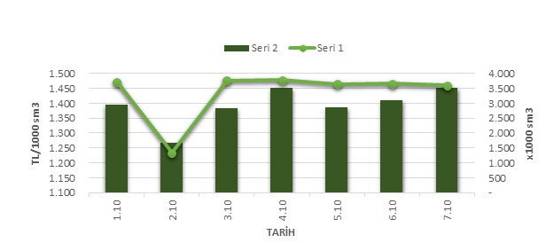 Organize Toptan Doğal Gaz Satış Piyasası (OTSP) dahilinde 01.10.2019 – 07.10.2019 tarihleri arası ortalama Gaz Referans Fiyatı (GRF) 1,435.67 TL/1000 sm3 olarak belirlenirken, aynı tarihler arasında toplam gerçekleşen eşleşmelerin miktarı ise 20,430 x1000 sm3 olarak belirlendi. İlgili tarihler arasında günlük Gaz Referans Fiyatı (GRF) ile Eşleşme Miktarı verileri aşağıdaki grafikte yer almaktadır.