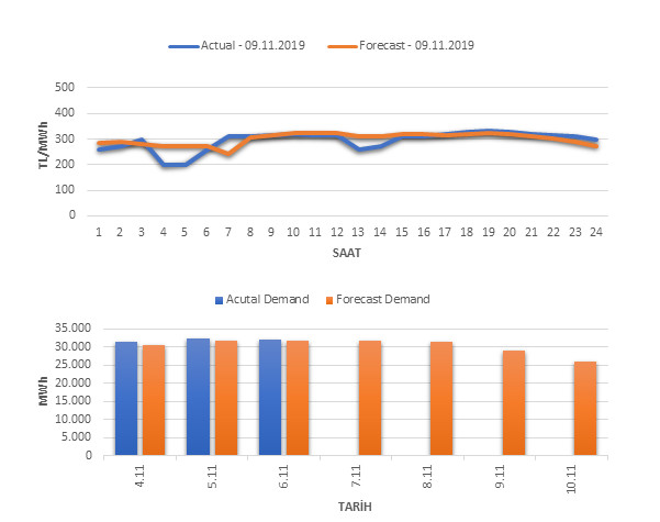 Tahminleme Modeli* analizi sonucu ortalama piyasa takas fiyatı 301.68 TL/MWh ve ortalama tüketim 29,049 MWh olarak öngörülmektedir. Modelin piyasa takas fiyatına dair başarı oranı günlük % 77, tüketime dair başarı oranı** ise günlük % 99 olarak hesaplanırken, bugüne kadar yapılan piyasa takas fiyatına dair analizlere göre başarı oranı % 91, tüketime dair başarı oranı ise % 93 olarak hesaplanmaktadır. Saatlik yarın için oluşan ve tahmin edilen piyasa takas fiyatları ile haftalık bazda tahmin edilen ve gerçekleştikçe yer alacak günlük ortalama tüketim değerleri aşağıdaki grafiklerde yer almaktadır.