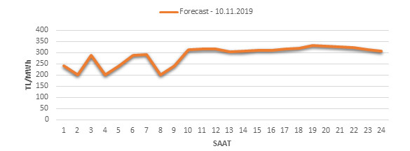 Yarından sonraki gün için oluşacak ortalama piyasa takas fiyatı 287.8 TL/MWH olarak tahmin edilmektedir. Buna bağlı olarak günün maksimum fiyatı 330.57 TL/MWh olarak 18:00 – 19:00 saat aralığında, minimum fiyatı 200 TL/MWh olarak 01:00 – 02:00 saat aralığında gerçekleşeceği öngörülmektedir. Puant saatlerde (17:00 – 22:00) tahmini ortalama piyasa takas fiyatı ise 322.39 TL/MWh olarak hesaplanabilmektedir. Saatlik oluşacak piyasa takas fiyatı tahminleri aşağıdaki grafikte yer almaktadır.