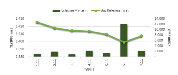 Organize Toptan Doğal Gaz Satış Piyasası (OTSP) dahilinde 01.11.2019 – 07.11.2019 tarihleri arası ortalama Gaz Referans Fiyatı (GRF) 1,412.6 TL/1000 sm3 olarak belirlenirken, aynı tarihler arasında toplam gerçekleşen eşleşmelerin miktarı ise 21,644 x1000 sm3 olarak belirlendi. İlgili tarihler arasında günlük Gaz Referans Fiyatı (GRF) ile Eşleşme Miktarı verileri aşağıdaki grafikte yer almaktadır.