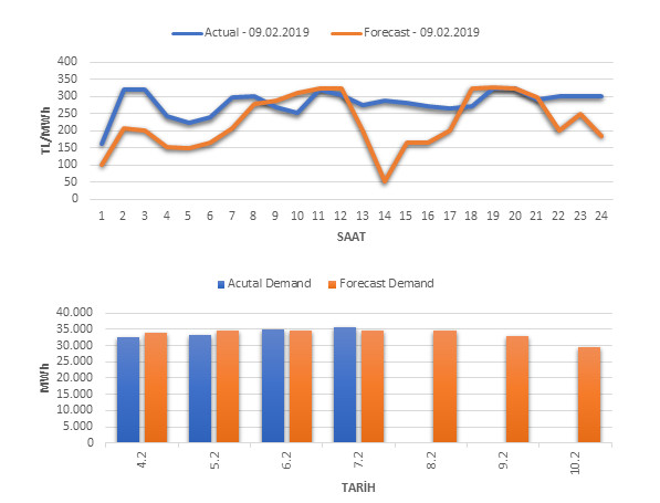 Tahminleme Modeli* analizi sonucu ortalama piyasa takas fiyatı 224.71 TL/MWh ve ortalama tüketim 32,816 MWh olarak öngörülmektedir. Modelin piyasa takas fiyatına dair başarı oranı günlük % 45, tüketime dair başarı oranı** ise günlük % 97 olarak hesaplanırken, bugüne kadar yapılan piyasa takas fiyatına dair analizlere göre başarı oranı % 88, tüketime dair başarı oranı ise % 94 olarak hesaplanmaktadır. Saatlik yarın için oluşan ve tahmin edilen piyasa takas fiyatları ile haftalık bazda tahmin edilen ve gerçekleştikçe yer alacak günlük ortalama tüketim değerleri aşağıdaki grafiklerde yer almaktadır.