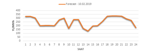 Yarından sonraki gün için oluşacak ortalama piyasa takas fiyatı 252.11 TL/MWH olarak tahmin edilmektedir. Buna bağlı olarak günün maksimum fiyatı 328.72 TL/MWh olarak 18:00 – 19:00 saat aralığında, minimum fiyatı 130.32 TL/MWh olarak 13:00 – 14:00 saat aralığında gerçekleşeceği öngörülmektedir. Puant saatlerde (17:00 – 22:00) tahmini ortalama piyasa takas fiyatı ise 311.26 TL/MWh olarak hesaplanabilmektedir. Saatlik oluşacak piyasa takas fiyatı tahminleri aşağıdaki grafikte yer almaktadır.