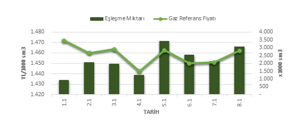 Organize Toptan Doğal Gaz Satış Piyasası (OTSP) dahilinde 01.02.2019 – 08.02.2019 tarihleri arası ortalama Gaz Referans Fiyatı (GRF) 1,457.79 TL/1000 sm3 olarak belirlenirken, aynı tarihler arasında toplam gerçekleşen eşleşmelerin miktarı ise 17,388 x1000 sm3 olarak belirlendi. İlgili tarihler arasında günlük Gaz Referans Fiyatı (GRF) ile Eşleşme Miktarı verileri aşağıdaki grafikte yer almaktadır.