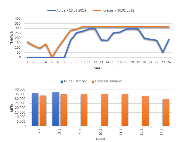 Tahminleme Modeli* analizi sonucu ortalama piyasa takas fiyatı 257.67 TL/MWh ve ortalama tüketim 35,283 MWh olarak öngörülmektedir. Modelin piyasa takas fiyatına dair başarı oranı günlük % 62, tüketime dair başarı oranı** ise günlük % 94 olarak hesaplanırken, bugüne kadar yapılan piyasa takas fiyatına dair analizlere göre başarı oranı % 88, tüketime dair başarı oranı ise % 94 olarak hesaplanmaktadır. Saatlik yarın için oluşan ve tahmin edilen piyasa takas fiyatları ile haftalık bazda tahmin edilen ve gerçekleştikçe yer alacak günlük ortalama tüketim değerleri aşağıdaki grafiklerde yer almaktadır.