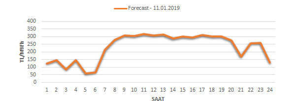 Yarından sonraki gün için oluşacak ortalama piyasa takas fiyatı 232.58 TL/MWH olarak tahmin edilmektedir. Buna bağlı olarak günün maksimum fiyatı 318.22 TL/MWh olarak 10:00 – 11:00 saat aralığında, minimum fiyatı 57.98 TL/MWh olarak 04:00 – 05:00 saat aralığında gerçekleşeceği öngörülmektedir. Puant saatlerde (17:00 – 22:00) tahmini ortalama piyasa takas fiyatı ise 261.84 TL/MWh olarak hesaplanabilmektedir. Saatlik oluşacak piyasa takas fiyatı tahminleri aşağıdaki grafikte yer almaktadır.
