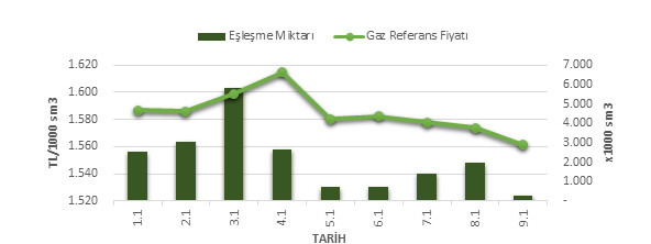 Organize Toptan Doğal Gaz Satış Piyasası (OTSP) dahilinde 01.12.2018 – 09.01.2019 tarihleri arası ortalama Gaz Referans Fiyatı (GRF) 1,584.67 TL/1000 sm3 olarak belirlenirken, aynı tarihler arasında toplam gerçekleşen eşleşmelerin miktarı ise 19,083 x1000 sm3 olarak belirlendi. İlgili tarihler arasında günlük Gaz Referans Fiyatı (GRF) ile Eşleşme Miktarı verileri aşağıdaki grafikte yer almaktadır.