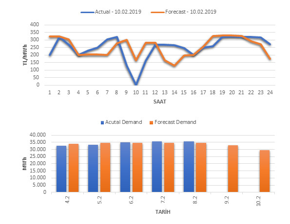 Tahminleme Modeli* analizi sonucu ortalama piyasa takas fiyatı 252.11 TL/MWh ve ortalama tüketim 29,503 MWh olarak öngörülmektedir. Modelin piyasa takas fiyatına dair başarı oranı günlük % 75, tüketime dair başarı oranı** ise günlük % 97 olarak hesaplanırken, bugüne kadar yapılan piyasa takas fiyatına dair analizlere göre başarı oranı % 88, tüketime dair başarı oranı ise % 94 olarak hesaplanmaktadır. Saatlik yarın için oluşan ve tahmin edilen piyasa takas fiyatları ile haftalık bazda tahmin edilen ve gerçekleştikçe yer alacak günlük ortalama tüketim değerleri aşağıdaki grafiklerde yer almaktadır.