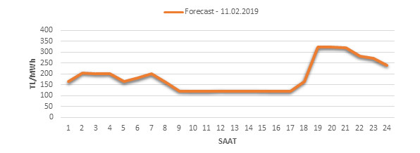 Yarından sonraki gün için oluşacak ortalama piyasa takas fiyatı 188.57 TL/MWH olarak tahmin edilmektedir. Buna bağlı olarak günün maksimum fiyatı 323.95 TL/MWh olarak 19:00 – 20:00 saat aralığında, minimum fiyatı 122.02 TL/MWh olarak 15:00 – 16:00 saat aralığında gerçekleşeceği öngörülmektedir. Puant saatlerde (17:00 – 22:00) tahmini ortalama piyasa takas fiyatı ise 281.45 TL/MWh olarak hesaplanabilmektedir. Saatlik oluşacak piyasa takas fiyatı tahminleri aşağıdaki grafikte yer almaktadır.