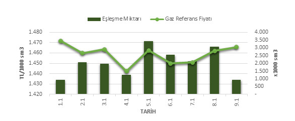 Organize Toptan Doğal Gaz Satış Piyasası (OTSP) dahilinde 01.02.2019 – 09.02.2019 tarihleri arası ortalama Gaz Referans Fiyatı (GRF) 1,458.66 TL/1000 sm3 olarak belirlenirken, aynı tarihler arasında toplam gerçekleşen eşleşmelerin miktarı ise 18,329 x1000 sm3 olarak belirlendi. İlgili tarihler arasında günlük Gaz Referans Fiyatı (GRF) ile Eşleşme Miktarı verileri aşağıdaki grafikte yer almaktadır.
