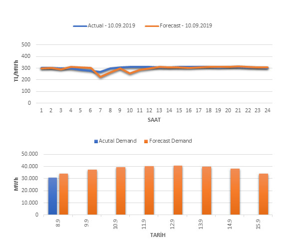Tahminleme Modeli* analizi sonucu ortalama piyasa takas fiyatı 298.92 TL/MWh ve ortalama tüketim 39,512 MWh olarak öngörülmektedir. Modelin piyasa takas fiyatına dair başarı oranı günlük % 58, tüketime dair başarı oranı** ise günlük % 89 olarak hesaplanırken, bugüne kadar yapılan piyasa takas fiyatına dair analizlere göre başarı oranı % 91, tüketime dair başarı oranı ise % 94 olarak hesaplanmaktadır. Saatlik yarın için oluşan ve tahmin edilen piyasa takas fiyatları ile haftalık bazda tahmin edilen ve gerçekleştikçe yer alacak günlük ortalama tüketim değerleri aşağıdaki grafiklerde yer almaktadır.