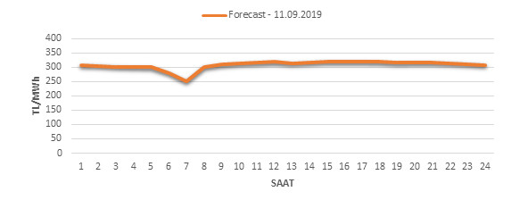 Yarından sonraki gün için oluşacak ortalama piyasa takas fiyatı 307.61 TL/MWH olarak tahmin edilmektedir. Buna bağlı olarak günün maksimum fiyatı 319.37 TL/MWh olarak 14:00 – 15:00 saat aralığında, minimum fiyatı 250.01 TL/MWh olarak 06:00 – 07:00 saat aralığında gerçekleşeceği öngörülmektedir. Puant saatlerde (17:00 – 22:00) tahmini ortalama piyasa takas fiyatı ise 314.97 TL/MWh olarak hesaplanabilmektedir. Saatlik oluşacak piyasa takas fiyatı tahminleri aşağıdaki grafikte yer almaktadır.